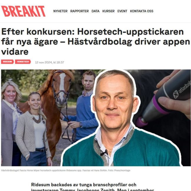 Breakit skriver en artikel om Fascia Horse köp av Horsetech-plattformen Ridesum.